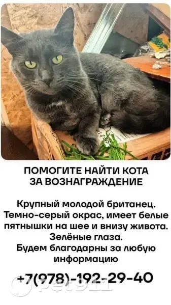 Пропал кот! Пожалуйста, максимальный репост! Вознаграждение 10 000 рублей. Помогите найти кота. Крупный британец. Темно-серый окрас, имеет белые пятнышки на шее и внизу живота. Зелёные глаза. Будем благодарны за любую информацию ± Имя хозяина: Екатерина Телефон: 79781922940 Адрес: улица Горького, 20, Симферополь