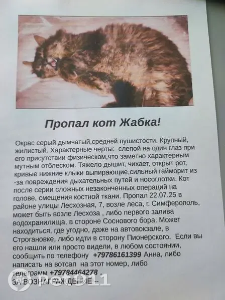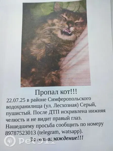 Пропал кот, ул. Лесхозная, Симферополь - сломана нижняя челюсть