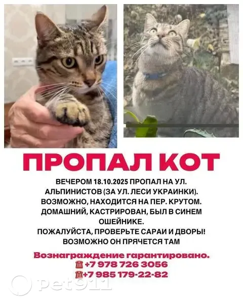 Потерянные животные Симферополь, фото: Пропал кот Джексон, ул. Чехова, 27
