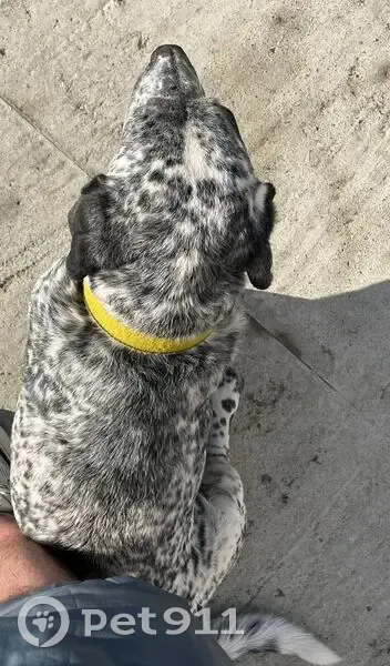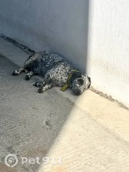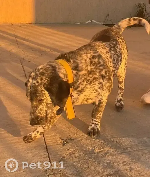 Пестрый пес в желтом ошейнике, пес до колена, небольшой. Передние лапы чуть кривые. Лает низким голосом. Последний раз видели на мосту ул чемпионов Сириус. Возможно он где-то в сириусе если ушел в ту сторону. Живет в селе Верхневеселое.
