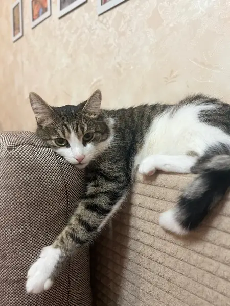 Кот беспордный, полосато белый! Появился невзначай, у нас в деревне только 2 коши ( 1 кот и кошка) они его не принимают значит чужой! Может подкинули , рядом трасса!