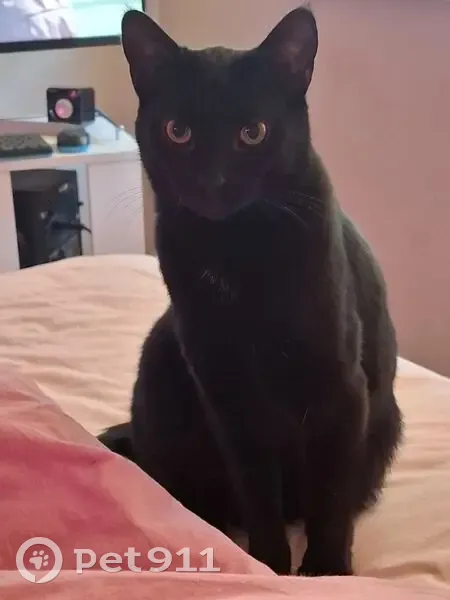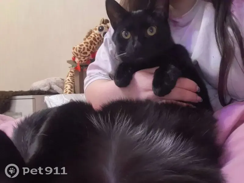 Черный , пару белых волос на груди. Белый клок, ярко выражен под передней лапой. Немного белых волос на животе. Упал с балкона. Очень боится не знакомых людей. Много мяукает