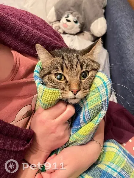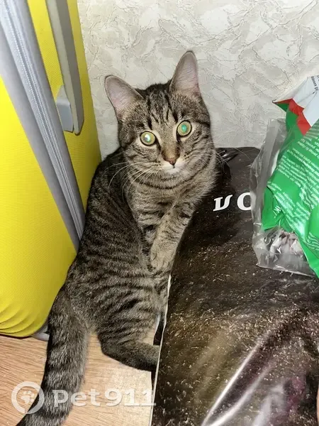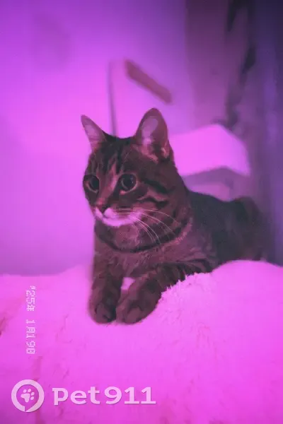 Серо-коричневый окрас, очень похож на самых обычных дворовых котов. Мы и сами его подобрали с улицы, когда он был совсем маленький. Его легко можно узнать по пятнышку в глазнице. Оно у него с детства. Думали , что будет слепой на один глаз , но получилось вылечить. Он очень ласковый. Мы живем на первом этаже и он отодвинул сетку на балконе и так сбежал.