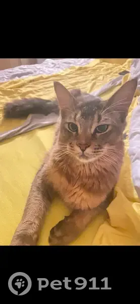 Коричнево-рыжий окрас, был в ошейнике с колокольчиком, порода чаузи, крупный, но ему чуть больше года, посторонних боится, гуляет во дворе дома, но первый раз не пришёл совсем, кастрирован, прививки все