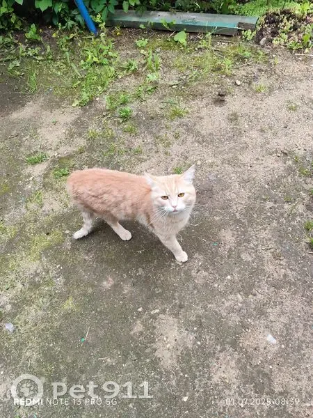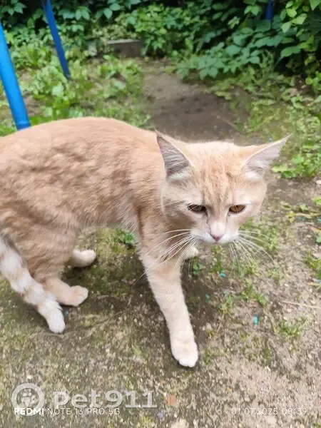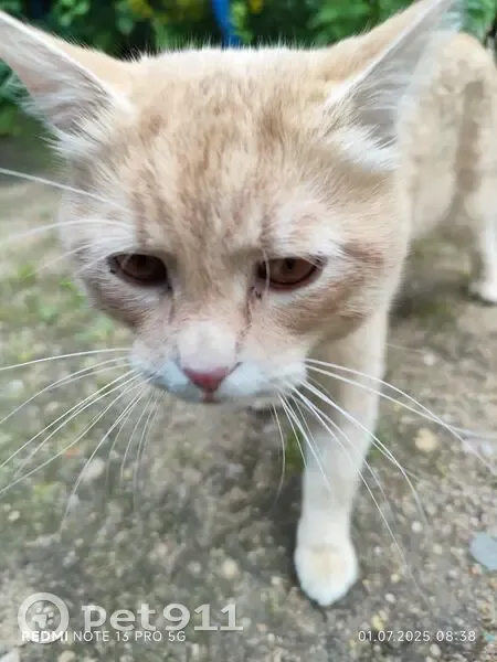 Найден домашний питомец. Очень ласковый,ухоженный. Видно,что рос в любви. Просится на ручки и смотрит в глаза. Со вчерашнего дня бегает в районе ул. Толмачева. На вид молодой.Окрас светло-рыжий. Видимо не голодный ещё,от еды отказался. Либо привык только к определенному корму.