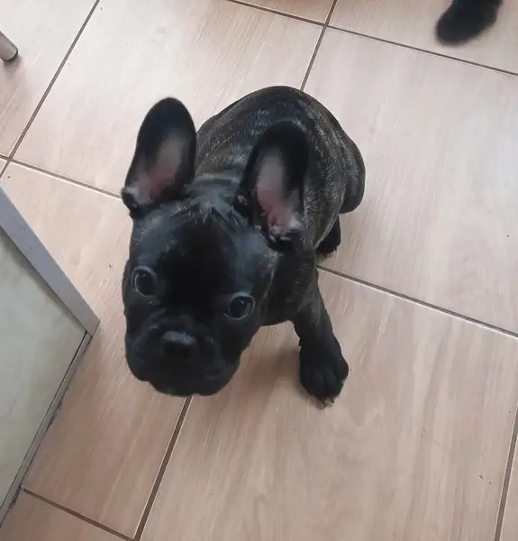 Сучка, чëрный окрас в серую полосочку, с ошейником блестящим. Французский бульдог, забежала в магазин.