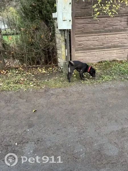 Черный окрас. Похож на шарпея. С красным ошейником. Спокойный, но подходить боится. Бегает с начала лета