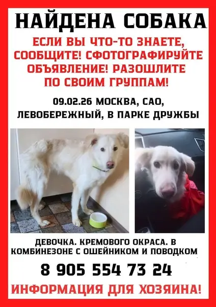 Порода Горная пиренейская собака, девочка, 2 года. Убежала с участка в поселке Снегири. Была точно замечена в поселке Садки, и по периметру между жд станциями Снегири и Миитовская, по неподтвержденной информации - в районе Павловской слободы. Цвет белый, собака пуглива, неагрессивна. За ней нельзя бежать! Если увидите - просьба обратиться по телефонам: 8 967 139 52 43, 8 985 766 15 12