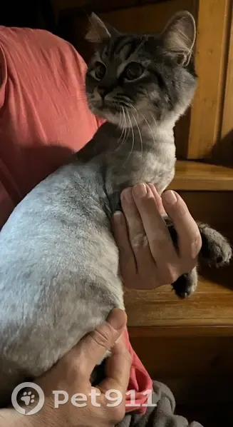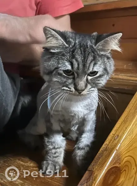 Окрас серо-полосатый, глаза желтые. Стрижка «под льва», хвост кисточкой. Была напугана, как забрали оказалась очень ласковой. Явно домашняя, чистая, вернем хозяевам!