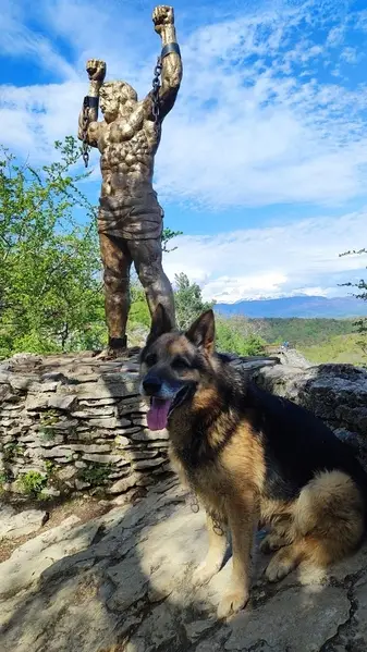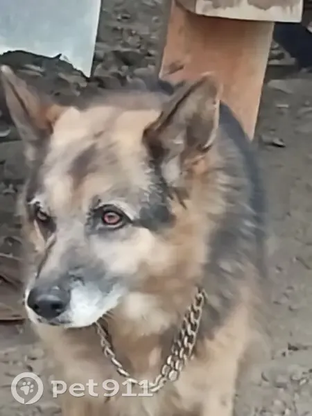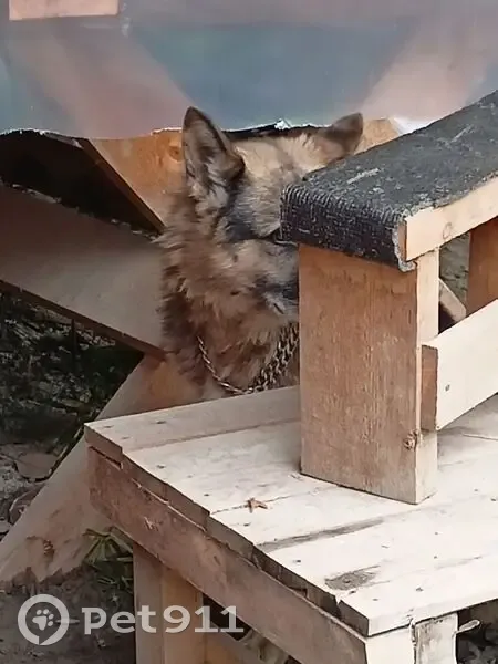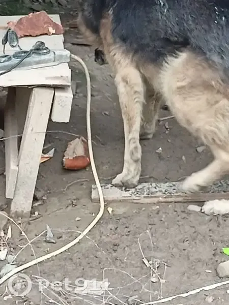 Овчарка прижилась к работникам на стройке. На шее цепочка исхудала и потрепана ещё пугается и прячется за стол . Какого пола не увидела. Смогла сфоткать только так.