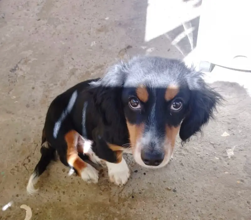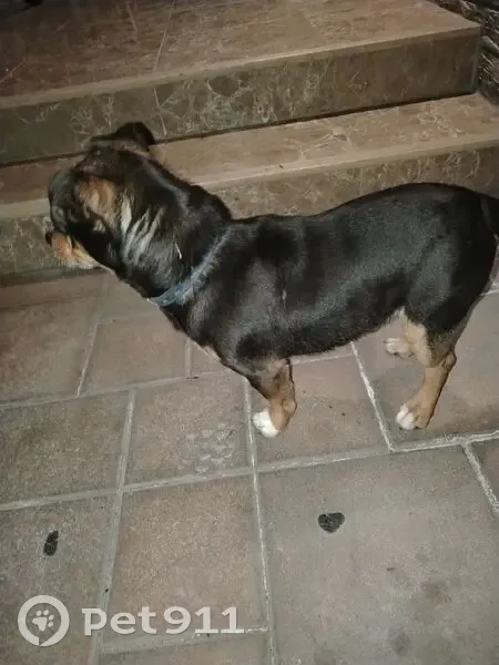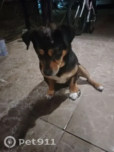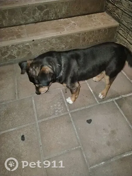 Небольшая собачка, размером с таксу, дружелюбная, в синем матерчатом ошейнике. На голове шишка, не истощена. Бегает за людьми. Хозяин, отзовись!