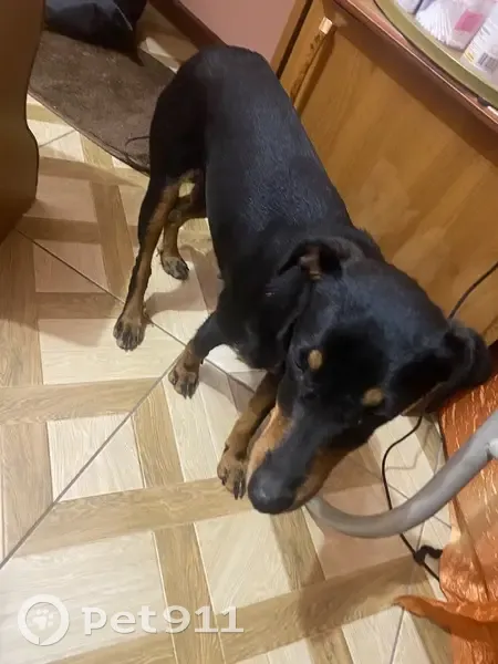 Сука , окрас чёрный с рыжими вкраплениями , хвост купирован . Знает команды или сюда )), ласковая скорее всего жила с хозяевами в помещении , любит спать на кровати