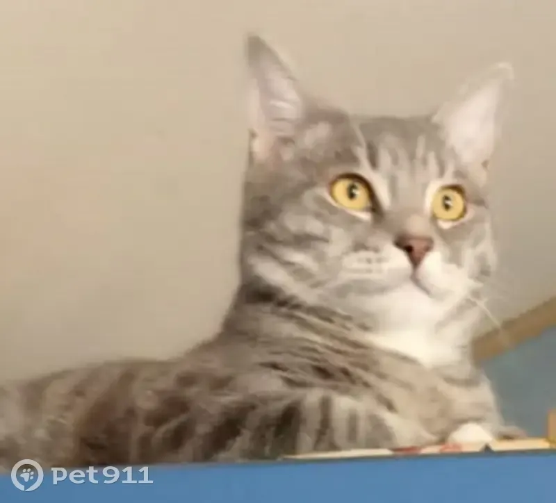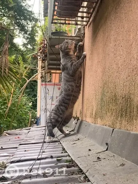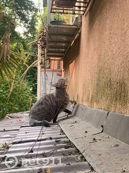 Домашний кот охотился за голубями и спрыгнул с 4 этажа. Кот домашний улицы никогда не видел. Не приспособлен жить на ней. Может попытаться залезть в окна 1 этажа. Кот- окрас серый с полосками и пятнами более темного цвета . Очень крупный вес около 7 кг. На животе курдючок.