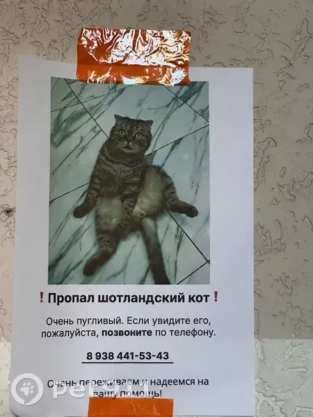 Кот упал с первого этажа , он поскользнулся , пошли его искать , но из-за веток и шороха он сильно испугался и убежал . Очень пугливый кот, даже боялся стук курьера . Любил прятаться под плед , теперь сильно переживаем за него . Облазила все кусты и партизаном молчит . Ищем 2 дня подряд . Вислоухий шотландский кот , ушки короткие , окрас серый/ белый . Правый глазик течет . По кличке Котя. Мы его очень сильно любим и надеемся на вашу помощь . Мой номер 89384415343 Кристина . Живем в Сочи , ул. Серафимовича 5 . Надеемся на вашу помощь