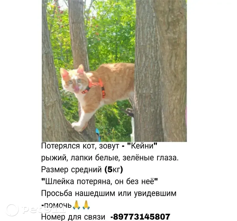Пропал кот, зовут Кейни. Рыженький, лапки белые. Людей боится, вряд ли пойдёт на контакт. Примерно 5 кг, крупный. Просьба нашедшим, увидевшим -позвонить по номеру 89773145807
