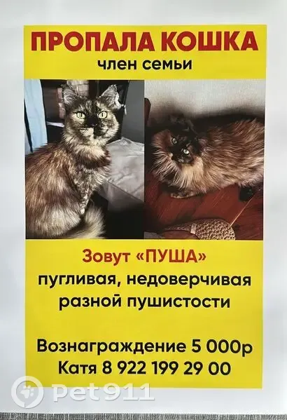 Пуша гуляет на улице, но ночевать всегда приходит домой. Мы переехали 13.11 и утром выпустили её, она с тех пор не возвращается((( Пушистая трехцветка в сером ошейнике, но его из-за шерсти не видно. Недоверчивая и царапучая с чужими. Очень ждем её домой, если увидите - придержите как-нибудь. Мы быстро приедем забрать. Вознаграждение 5.000₽