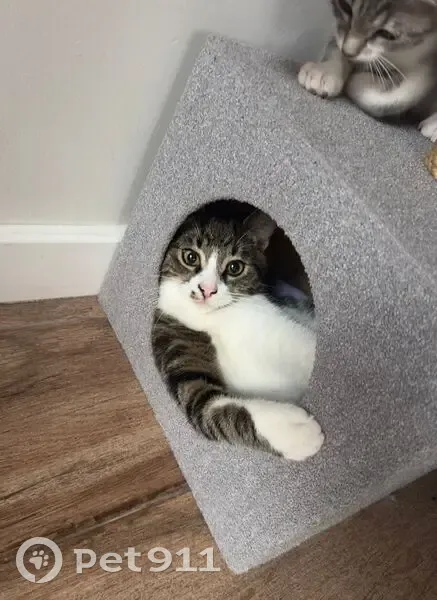 Откликается на кличку Рони. Окраска таби, правая передняя лапка как будто в гольфике, остальные три лапки белого окраса. На мордочке под носиком с правой стороны пятнышко.