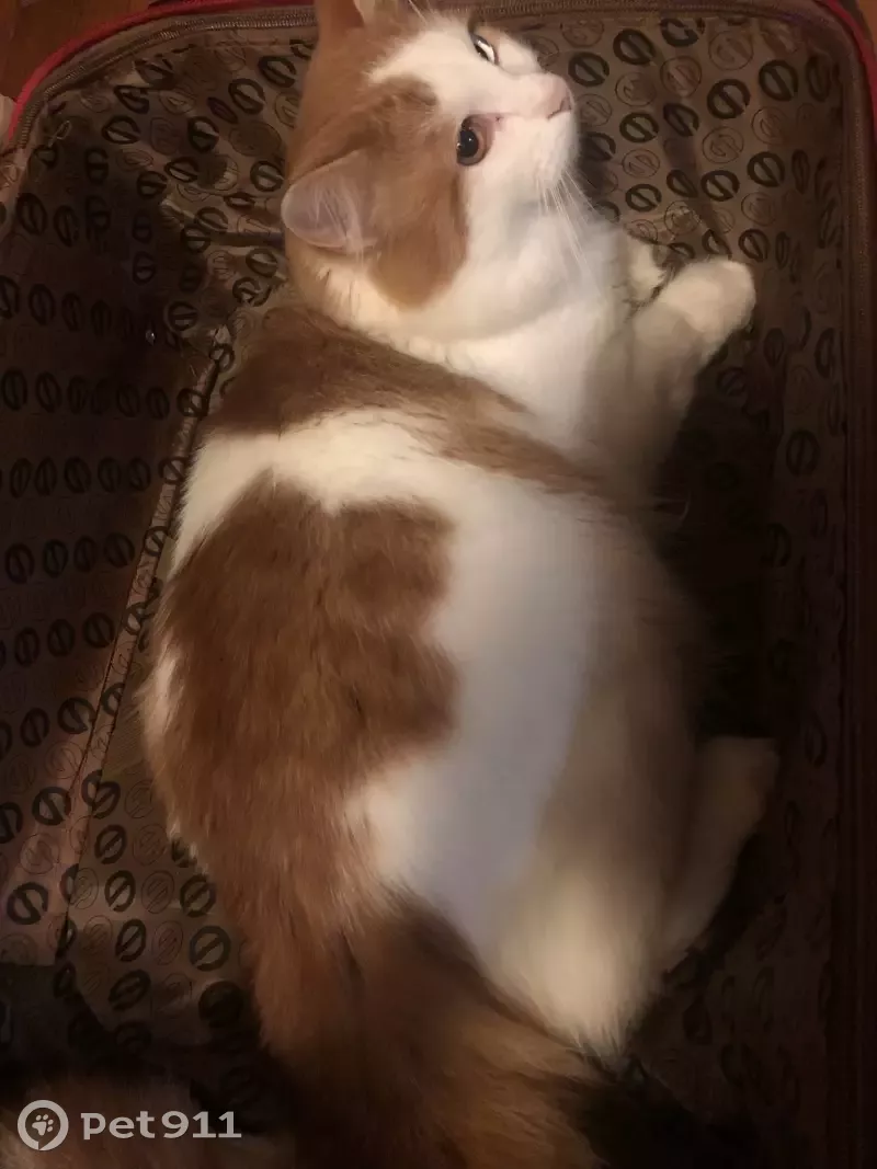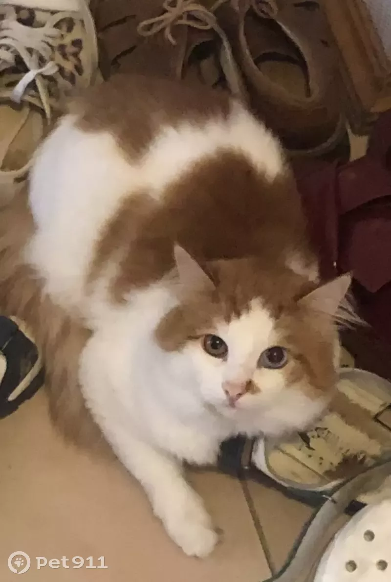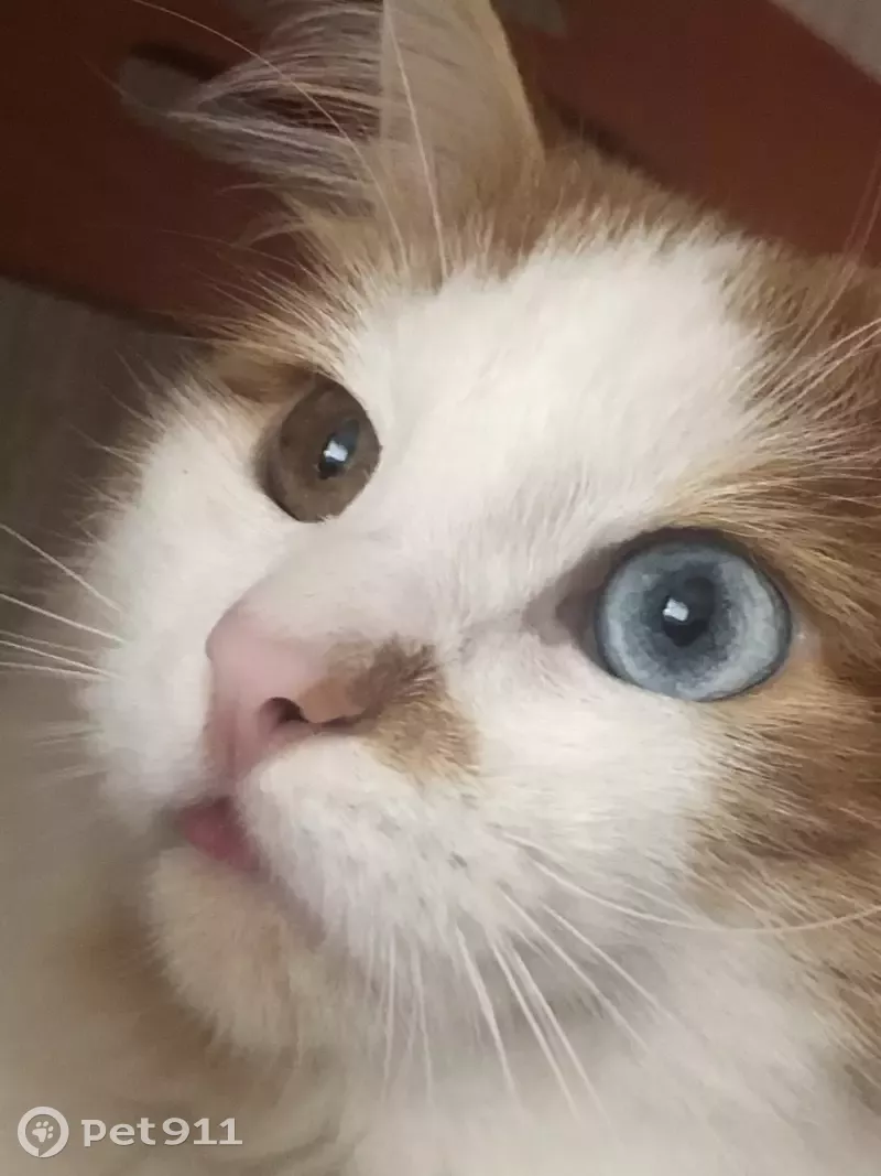 во время прогулки из шлейки вырвался кот окрас:белый в крупные рыжие пятна, хвост полностью рыжий, пушистый. глаза разного цвета(голубой и карий) шерсть средней длины, не гладкошерстный. возле носа, слева есть небольшое рыжее пятнышко зовут Феликс кот домашний, как поведет себя на улице-неизвестно кот очень пуглив