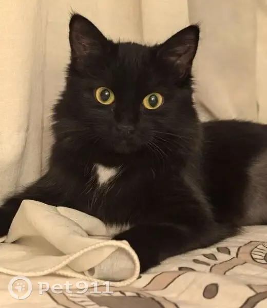 Пропала кошечка. Окрас чёрный с белым галстуком впереди на горлышке. На животике шрам после операции.
