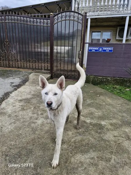 Кобель белой швейцарской овчарки, возраст три года, кличка Вилли. Из особых примет:потёртости-мозоли на локтевых сгибах передних лап.