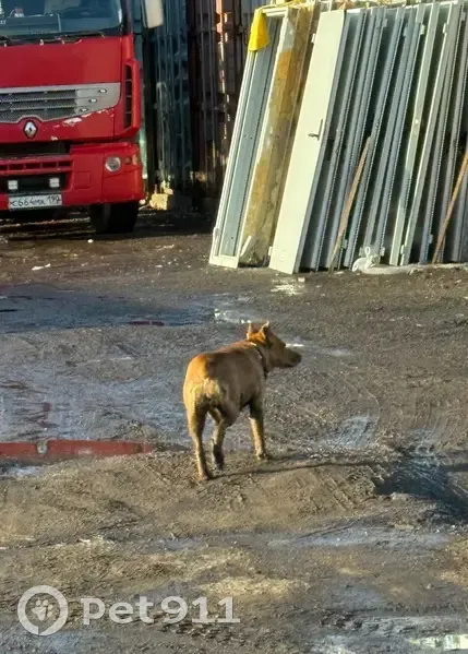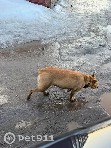 Собака без хвоста, есть ошейник, достаточно грязное пузо и лапы, возможно долго бегает. Поведение суетное, явно ищет, бегает хаотично, к машинам очень близко подбегает - опасно, не боится. Заглядывает в глаза и убегает.