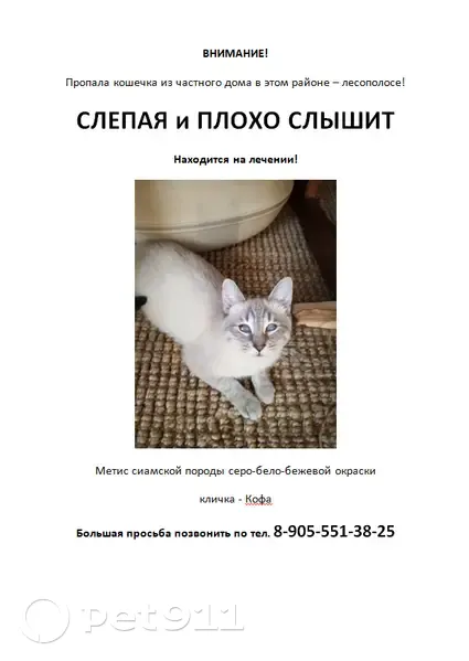 Серо-бело-бежевая окраска, хвост черный(или темно-серый) в полоску, также лапки с серыми полосами. Убежала с участка, подлезла под ворота, рядом лесополоса, пропажа произошла в выходные дни, было много машин приезжих-отдыхающих, возможно кто-то пожалел и взял. За вознаграждение - 5000 рублей.