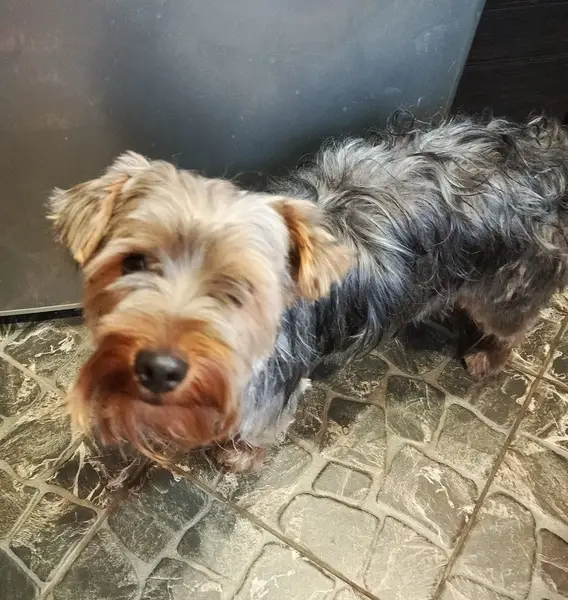 Коротко стриженный, по всему телу папилломы, одна большая на правой лопатке. Убежал на прогулке во дворе дома. Глаза белесые (собака старенькая 13 лет)