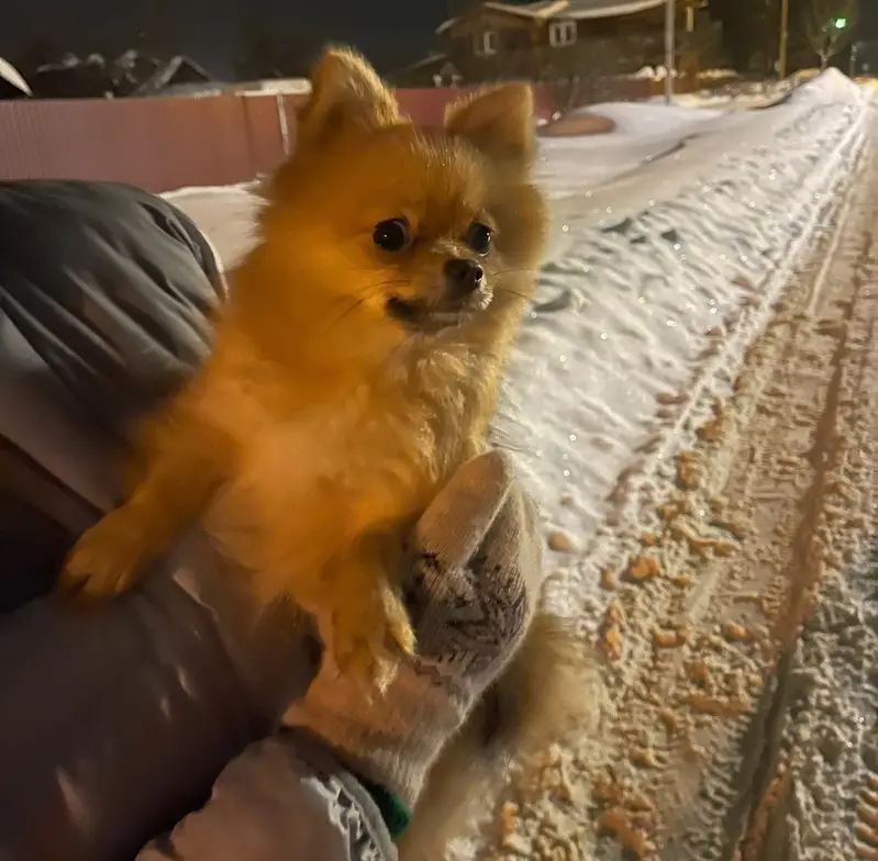 Мини шпиц окрас рыжий, силиконовый ошейник от клещей, зовут БОНЯ, возраст 9 лет, на пузе клеймо.