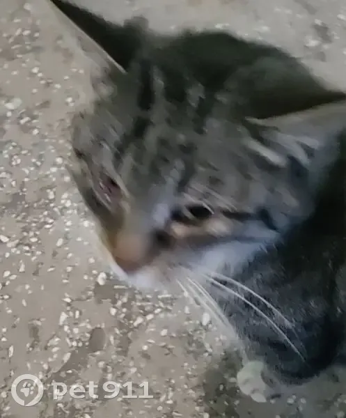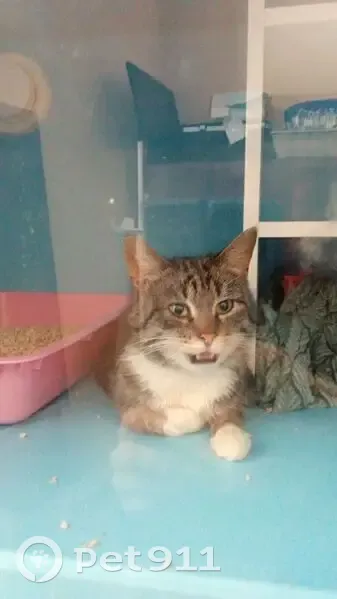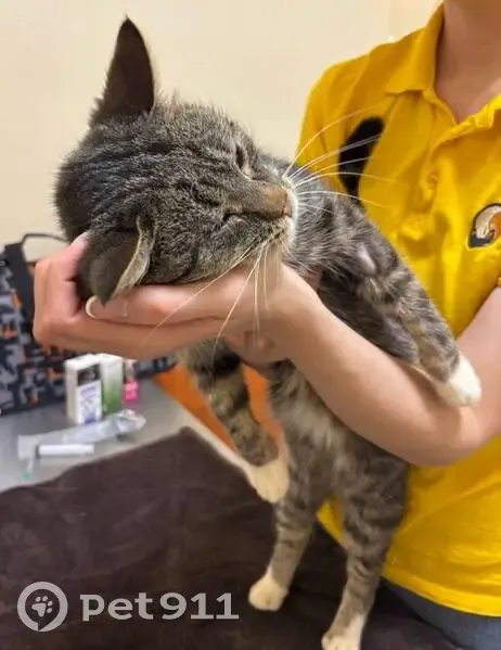 !СРОЧНО. НАЙДЕН! Полосатый котик с белой грудкой и лапками, короткая шерстка. Очень ласковый, настойчивый в общении с людьми. Возможно, был домашним. Нашла его у подъезда с опухшим красным глазом, хрипящим голосом и носом. Он прошёл двухнедельное лечение в стационаре, был кастрирован и ищет дом!