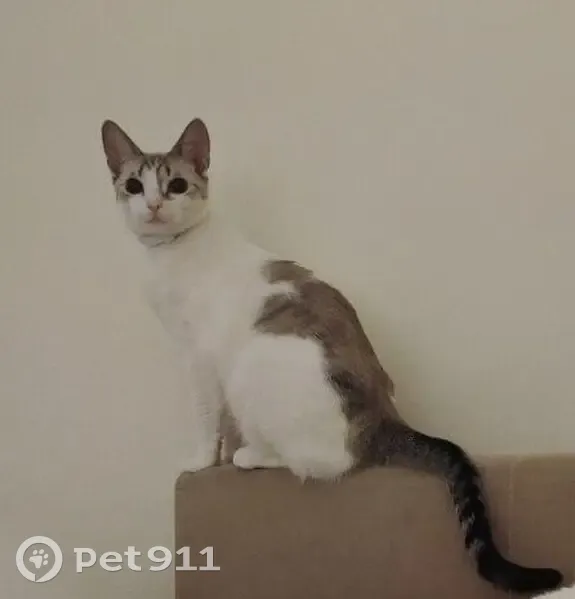 Пропала кошка, возраст около 2 лет, миниатюрная, окрас белый с пятнами и полосатым хвостом, ярко-голубые глаза. Первый раз приехала за город, очень пугливая.