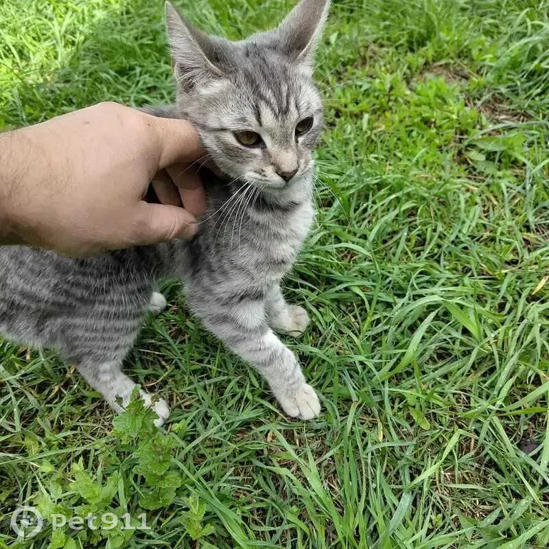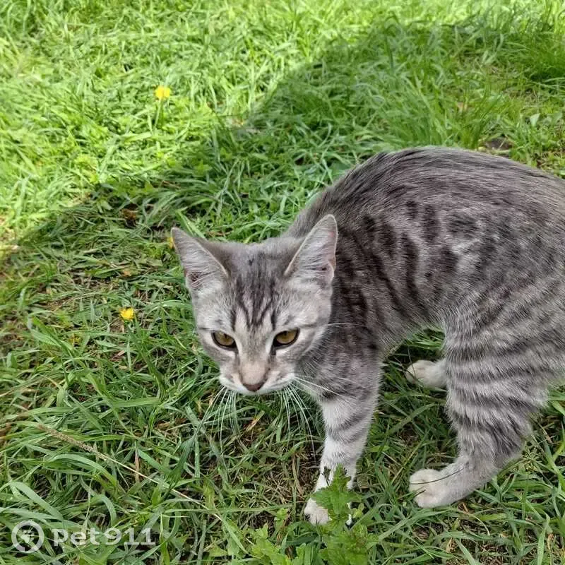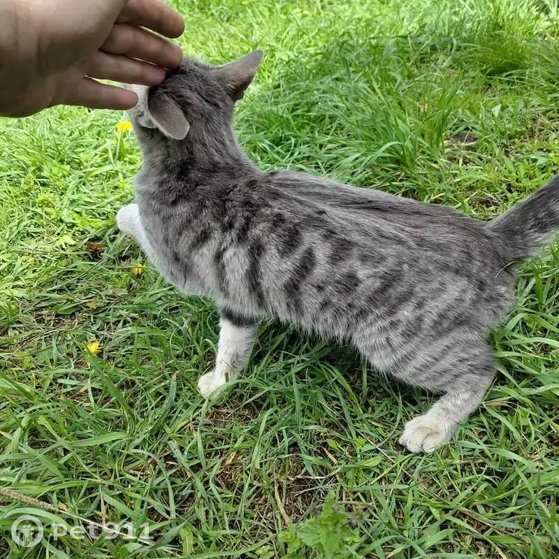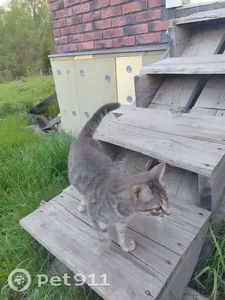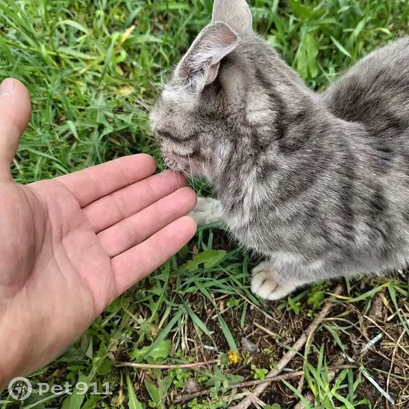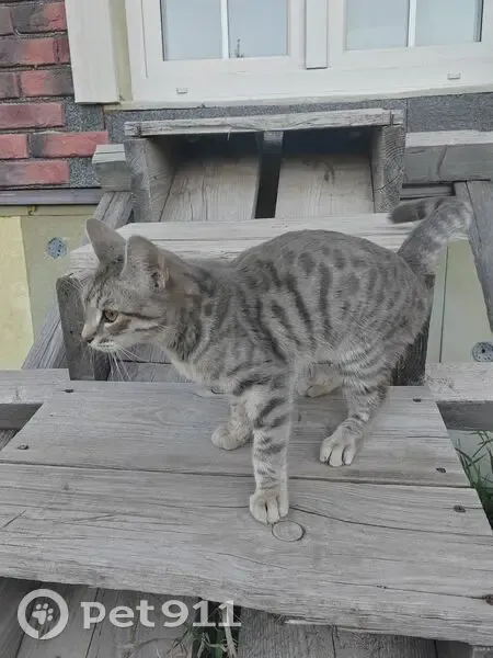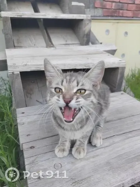 Серая кошка, на туловище окрас леопардовый, на лапах и хвосте - полосатый. Глаза желтые. Сильно голодна, видно, что домашняя. Мяучит, кусается, возможно сильно напугана. На карте Сосновки точка геолокации не отражается. Фактический адрес : село Сосновка, ул. Центральная, 205. 10 мая мы уедем(