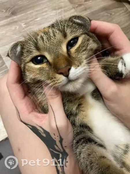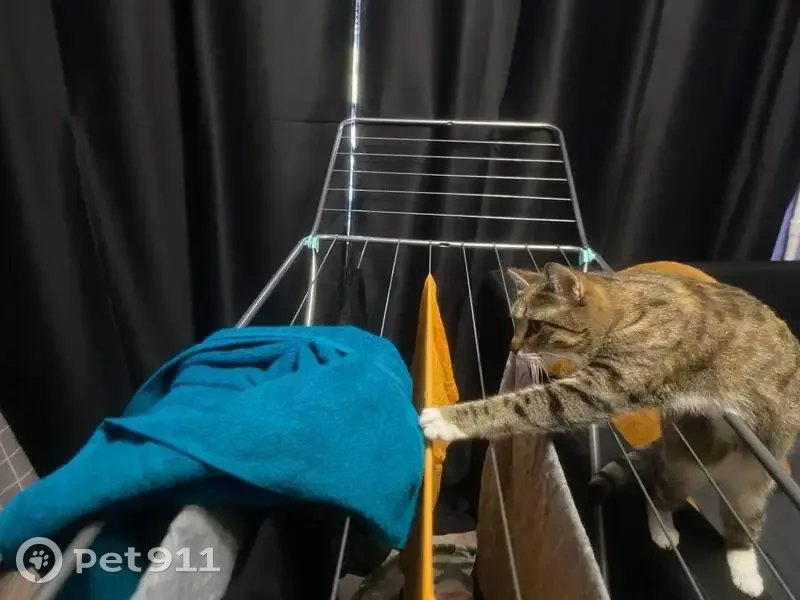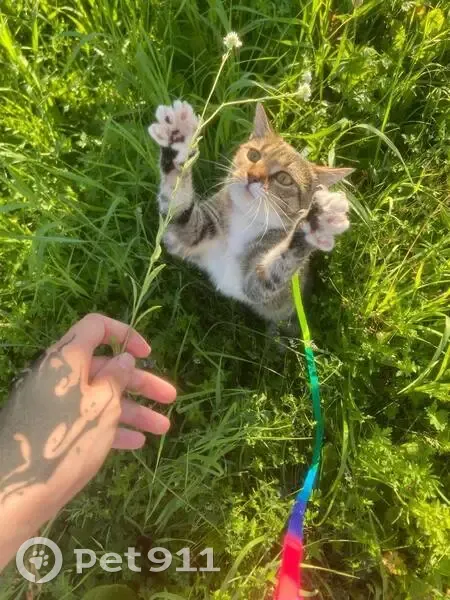 Зелено-янтарные глазки, полоски серые и черные, есть рыжие пятнышки по всему телу. Пальцы на лапах белые, носик коричневый с рыжиной. Грудь и живот белые. Маленькие черные кисточки на ушах. Контактная, есть привычка залезать на деревья. Возможно где-то прячется. Выпала с окна, может быть ранена. Примерное местоположение 1, 2, 3, 4 микрорайон.