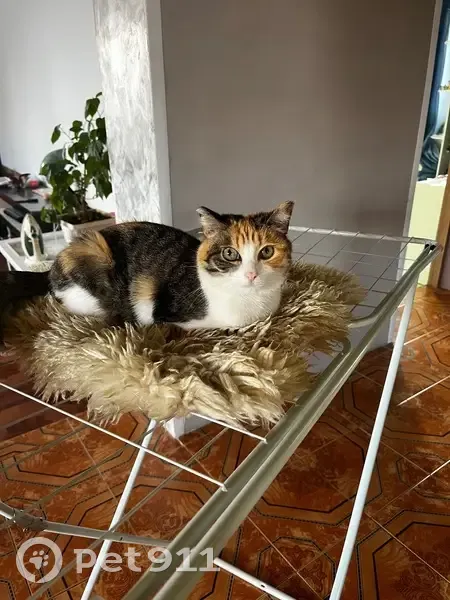 Трехцветная, хвост не двигается и укороченный, маленькая