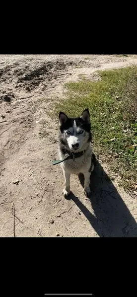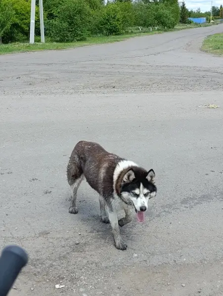 Чёрная с белым,кончик хвоста белый,как кисточка и голубые глаза!На носу шрам и его очень видно!Пропала 23 декабря 2025 года,в посёлке была в стае и после этого нигде её нет,мы очень надеемся,что она жива и мы её найдём,ребёнок её очень любит!Очень добрая и без проблем идёт к людям и детям