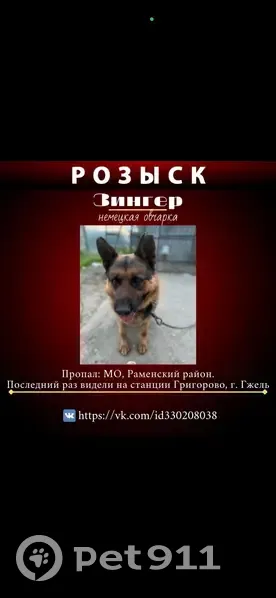 Мальчик, немецкая овчарка, хвост короче чем у других представителей породы, левое ухо погрызено, последний раз его видели 26.02. 25г утром на станции Григорово, г. Гжель, любая информация мне важно. Когда я видела его последний раз у него был коричневый кожаный ошейник
