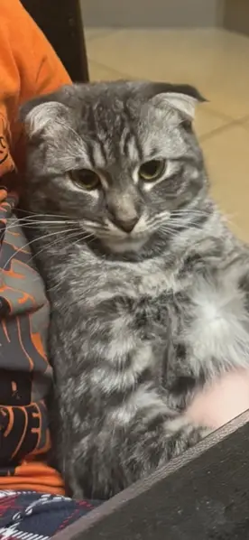 Кошка британка дымчатый окрас,желтые глаза,пришла к магазину кормов