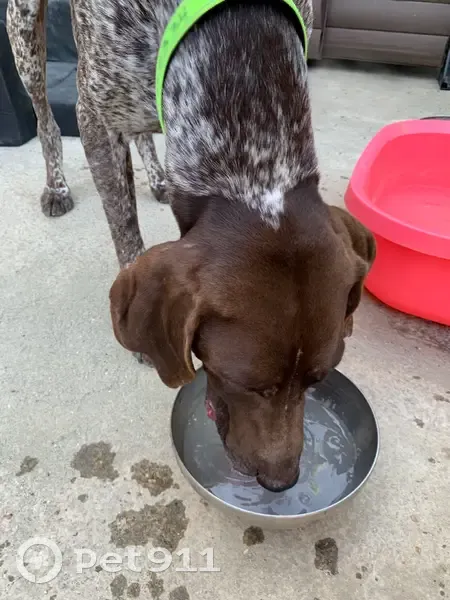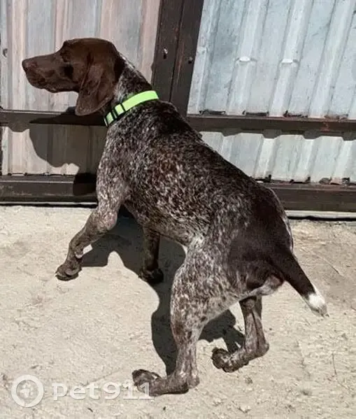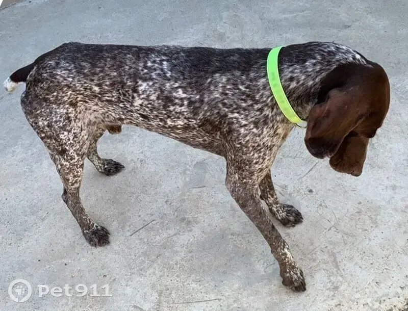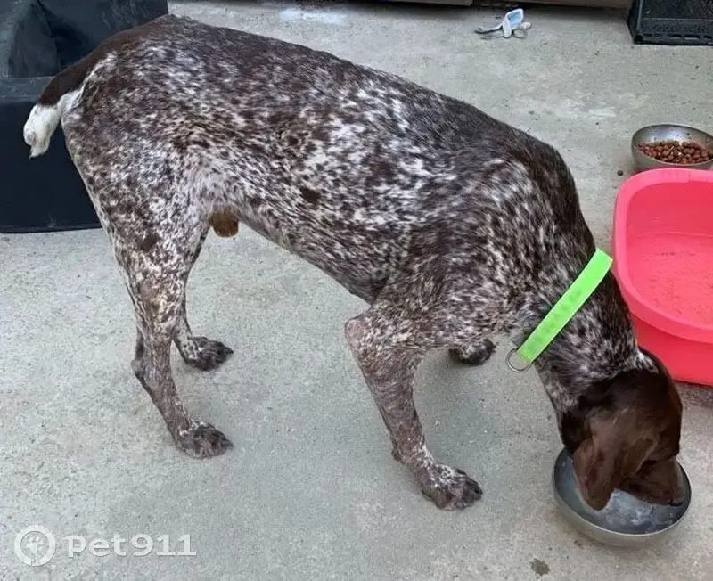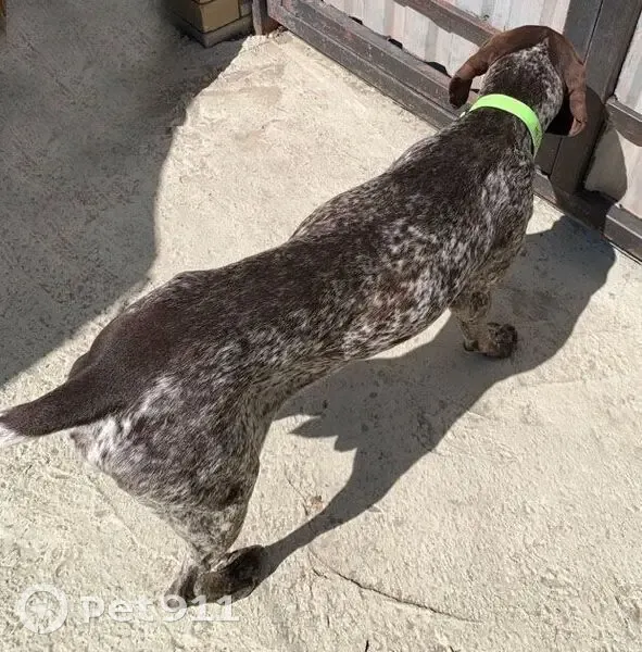 Собака породы Курцхаар, кобель, тело пятнистое, голова с шеи в коричневой маске, кончик хвоста белый. На переносице характерная тоненькая белая полосочка. Собаку нашли девушки в ауле Старобжегокай, был без ошейника. В объявлениях в телеграмм канале звериюга я нашла объявление, что этого же самого пса видели 3 июля в станице Елизаветинской, на рынке. Он может быть из Краснодара, окрестностей, возможно даже другого города, т. К. Пес по-видимому долго скитался.