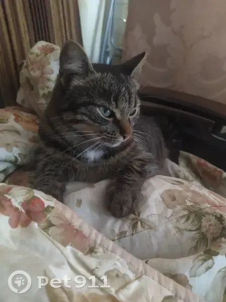 На шее есть белое пятно, по расцветке серая с темными полосками (есть светлые пятна на мордочке).