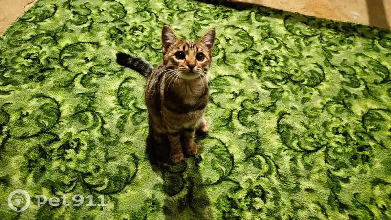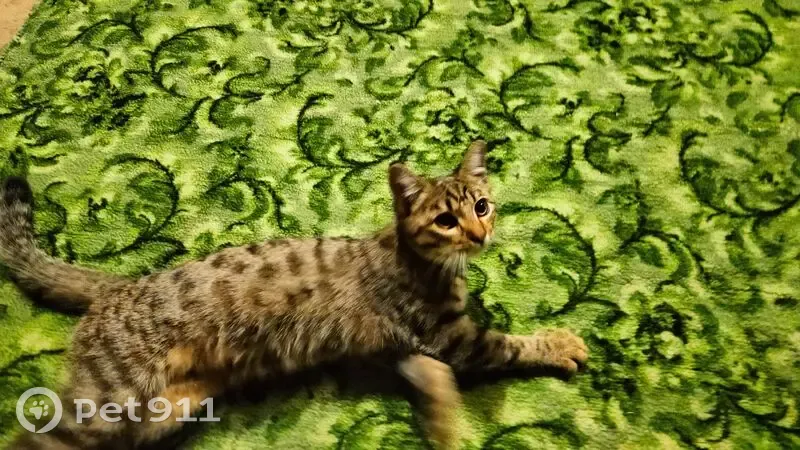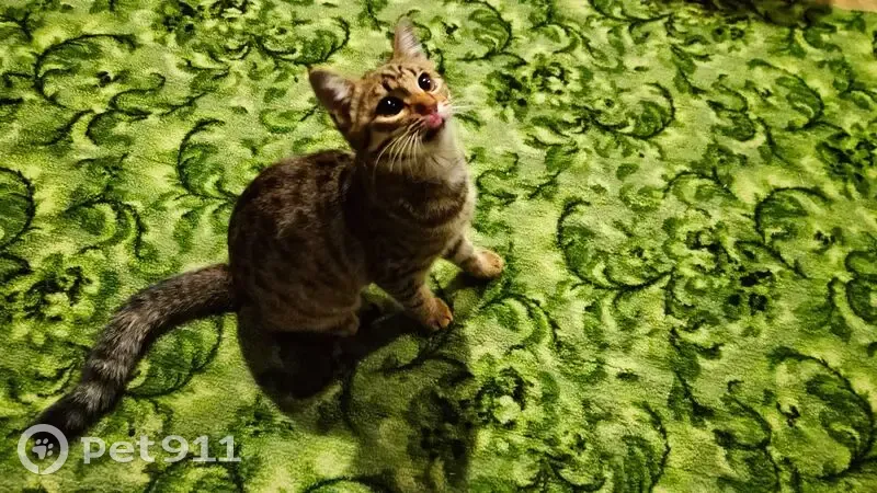 Классический камышовый окрас, ещё его называют "шпроты". Большие глаза медового цвета, белые усики, светлая манишка и недавно стриженные когти. Возраст примерно 5 месяцев. Подвижная и игривая, абсолютно ручная и ориентирована на человека. Отлично знает лоток с наполнителем, ест сухой корм и влажный. 11 сентября громко плакала у входной двери в подъезд многоквартирного дома и просилась войти. Сразу пошла на руки.