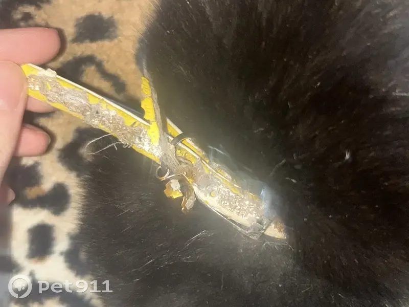 кошка очень ласковая, видела ее во дворе еще в ноябре, постоянно заходит к нам в подъезд( на карте отметила приблизительное место), 2 белых небольших пятнышка на теле, фото ошейника прикрепила