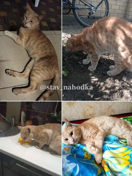 Рыжий котик, девочка или мальчик не знаю. Ухо правое немного порвало. Сидел на лавочке на детской площадке с высунутым языком. Дали воды ему, очень много выпил. Покормили, ел с аппетитом. Котик очень худой. Ветром сдувает его. На ошейник не было таблички с адресом. Ошейник чёрный.