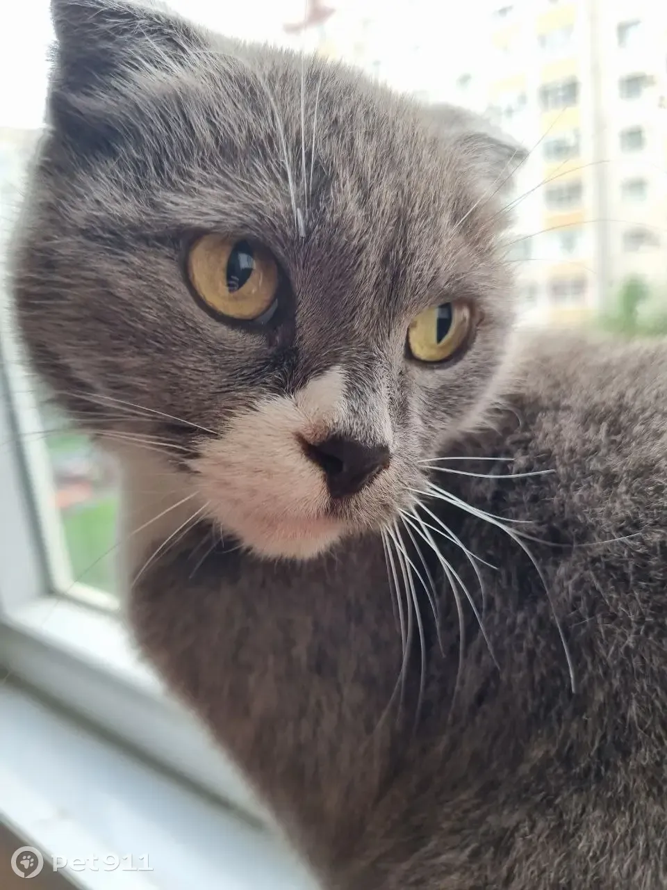 Найдена на лестничном пролете, сидела на ступеньках, одна из задних лап ранена, кровит. Рана выглядит не новой, шерсти на ней нет, в длину примерно 3-4 сантиметра, в ширину 1.5-2 сантиметра. Вислоухая серая кошка, не чистокровная британка, помесь. Туловище серое, глаза желтые, лапы и половина морды окрашено белые.