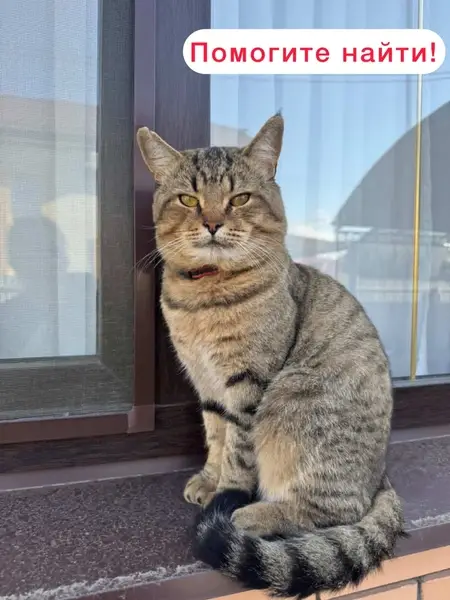 Беспородный, полосатый, коричневый, фиолетовый ошейник с бубенчиком. Найден на детской площадке во дворе, сидел мяукал, подбежал.
