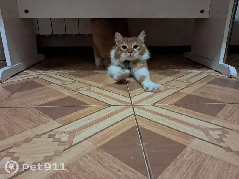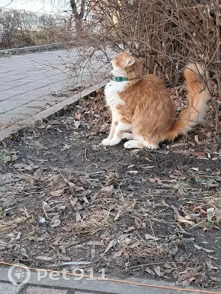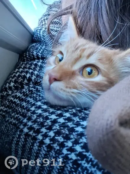 Нашлась кошка. Окрас: Рыжый табби, с белыми лапками и живот. У левого глаза белая полоса