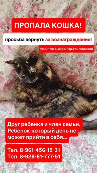 трехцветная , найдена кошка , очень ласковая , к лотку приучена , просьба забрать малышку , так как нет возможности ухаживать за ней. Довезу куда скажите