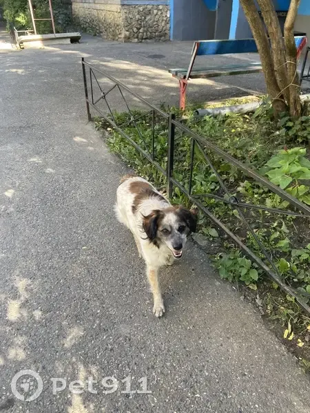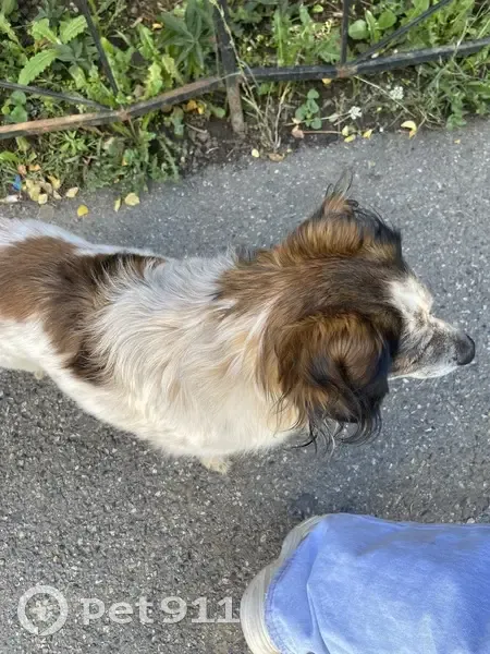 Трехцветная собака, длинношерстая, среднего размера, пол незнаю. Несколько дней бегает в районе улиц Макарова-Бруснева. Дружелюбная, на ошейнике болтается капсула-адресник, но низ капсулы утерян.