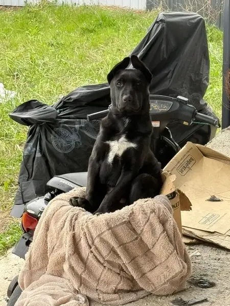 Щенок, чисто черный, девочка, внешне выглядит здоровой, на вид месяца 2-3,на шее коричневый ошейник с металлическими кнопками.Бегала по улице несколько дней, так говорят очевидцы, а мы спасли из-под колёс машины.