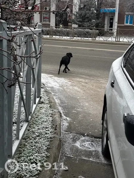 Черная молодая сучка, короткий хвост, на шее ошейник с зеленой кожаной биркой. В руки не дается, боится людей, не умеет переходить дорогу, перебегает на красный, вижу её постоянно утром в районе 9 утра и вечером 16-17 часов. Постоянно нюхает дорогу, пытается найти след хозяина. Первый раз увидела её в воскресенье 10 января 2026 года.