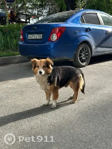 Найдена собака — среднего размера, с пушистой шерстью средней длины. Окрас шерсти комбинированный: черный на спине и голове, коричневый с белыми отметинами на морде, груди, лапах и частично на боках.Уши висячие, морда слегка удлиненная, глаза темные. Похожа на породу типа колли или овчарки, возможно, с примесью.