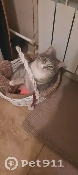 Левое ушко ближе к голове надорвано (не сильно заметно) но есть. На передних лапах словно очерчены небольшие туфельки белым цветом , полоска четко идет